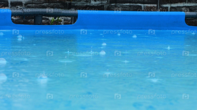 Капли дождя и пузыри на поверхности воды в бассейне с синей рамкой. Теплый летний дождь. Задний двор загородного дома