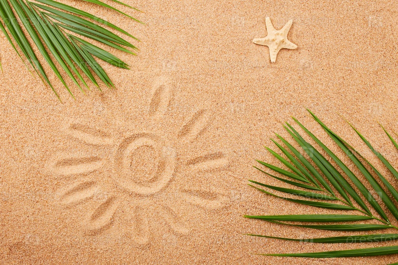 Морская звезда, пальмовые листья и рисунок солнца на песке на пляже