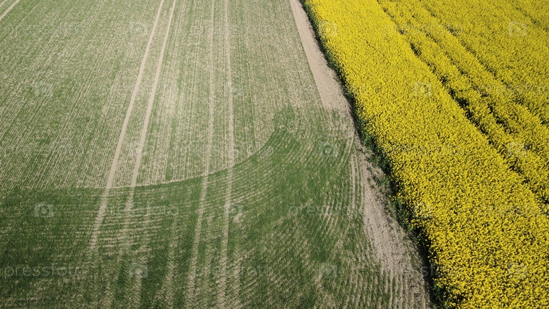 Граница двух полей. Цветущие желтые ростки рапса и злаков. Аэрофотосъемка