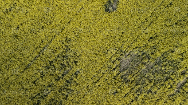 Поле изнасилования. Желтые цветы рапса. Граница двух полей. Аэрофотосъемка
