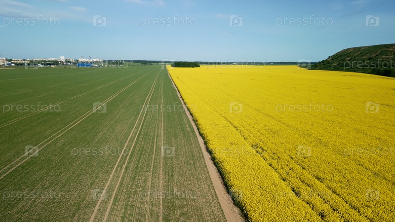 Граница двух полей. Цветущие желтые ростки рапса и злаков. На горизонте виден город. Аэрофотосъемка
