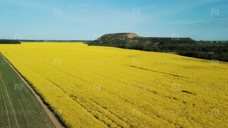 Поле цветущего желтого рапса. На краю поля находится законсервированная городская свалка. Аэрофотосъемка