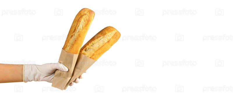 Два свежеиспеченных хрустящих багета, аккуратно завернутые в крафт-бумагу в руке в перчатке. Концепция выпечки, продажи свежего хлеба, доставки продуктов на порог и благотворительной помощи. Изолированные на белом фоне. Баннер, шаблон, место для текста