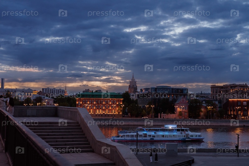 Городской пейзаж Москвы на закате. Вид на набережную