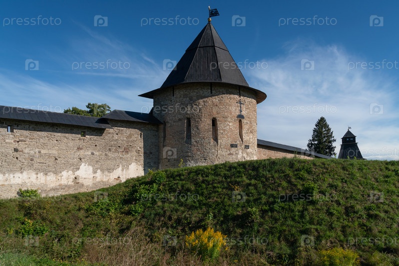 Вид на Изборскую башню Свято-Успенского Псково-Печерского монастыря в солнечный летний день, Печоры, Псковская область, Россия