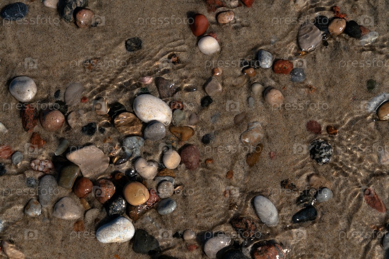 Разноцветные морские камешки на песке через морскую воду, Балтийское море, Куршская коса, Калининградская область, Россия