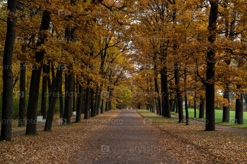 Вид на аллею Рамп, усыпанную опавшими листьями, в Екатерининском парке Царского Села в солнечный осенний день, Пушкин, Санкт-Петербург, Россия