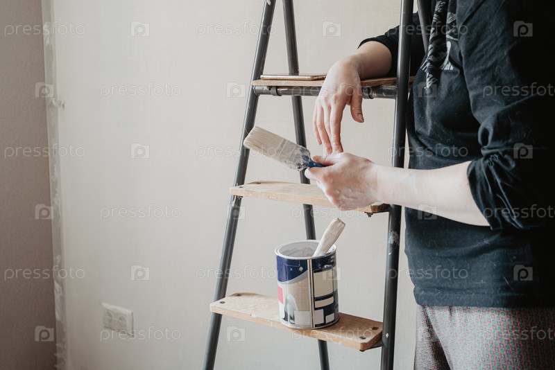 Человек, стоящий возле стремянки и держащий в руке кисть. Концепция ремонта дома