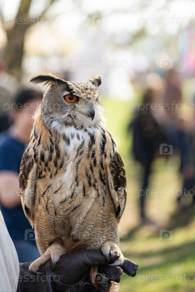 Большая сова сидит на руке владельца в перчатке