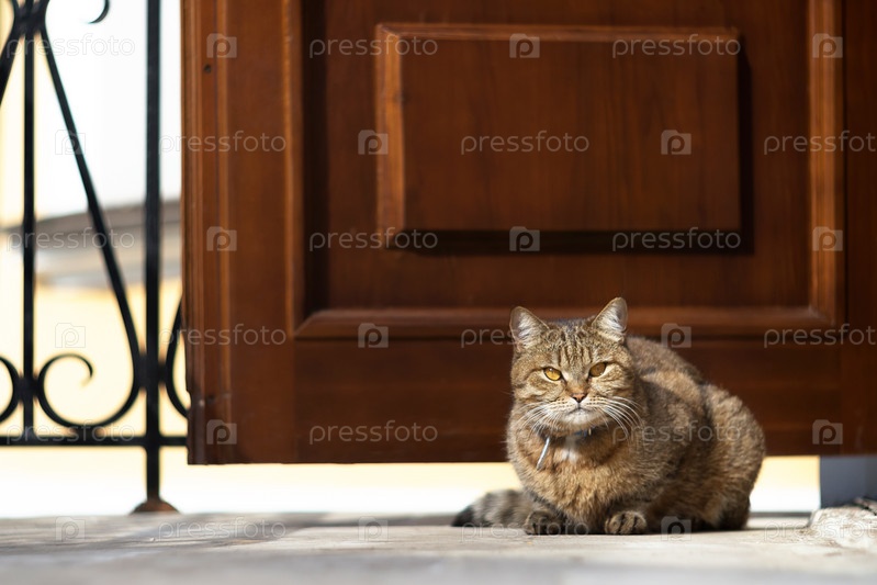 Домашняя кошка греется на солнышке у порога
