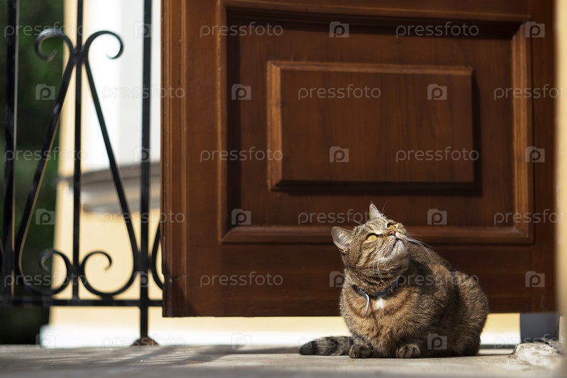 Домашняя кошка греется на солнышке у порога