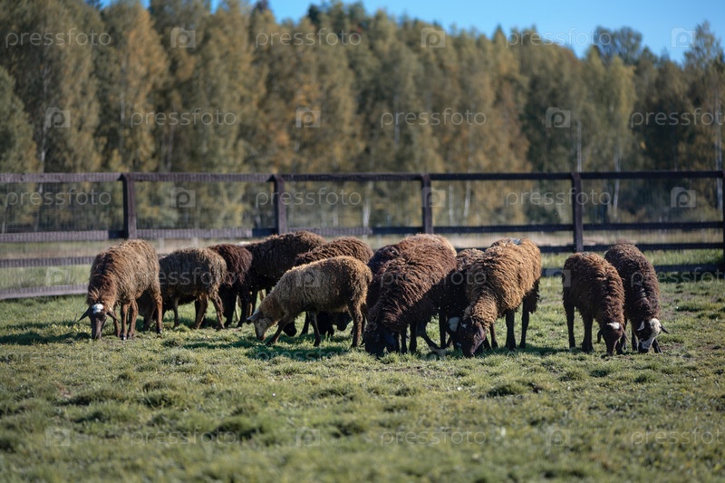 Стадо овец пасется в загоне на лугу летом