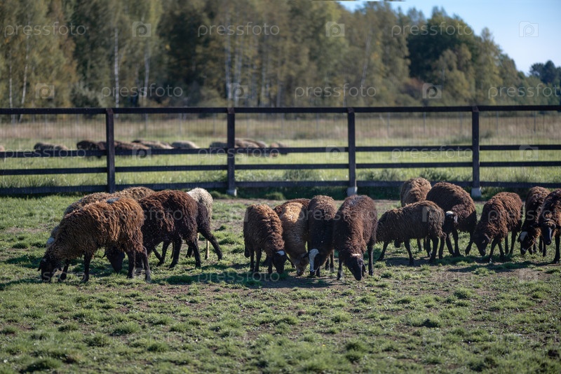 Стадо овец пасется в загоне на лугу летом