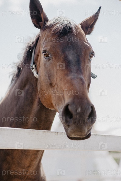 Коричневая лошадь склонила голову над деревянным забором