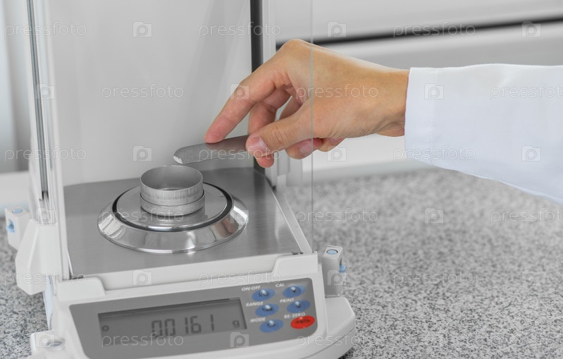 Химик в белом халате взвешивает белый порошок
