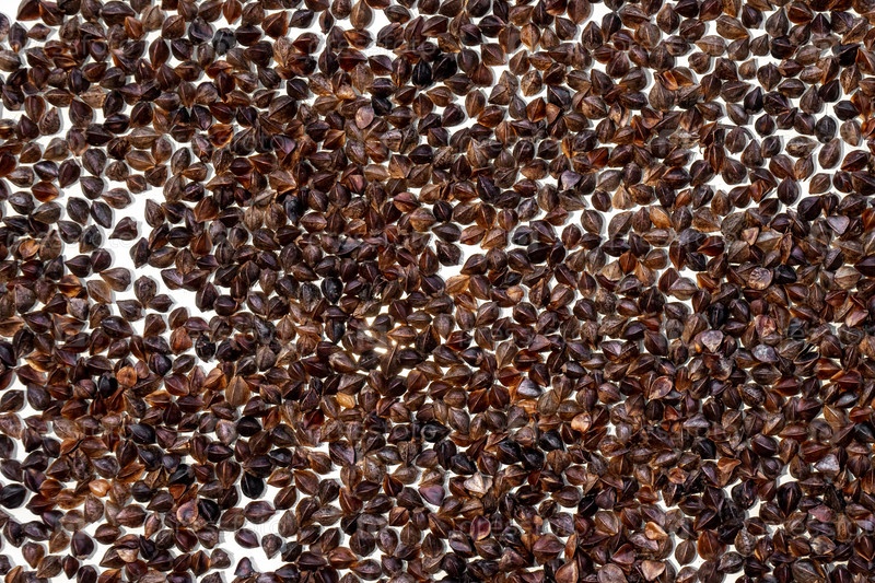 Фон из неочищенных цельных семян гречихи, размещенных на белом фоне на небольшом расстоянии друг от друга. Псевдозерновые сельскохозяйственные культуры. Крупный план. Вид сверху