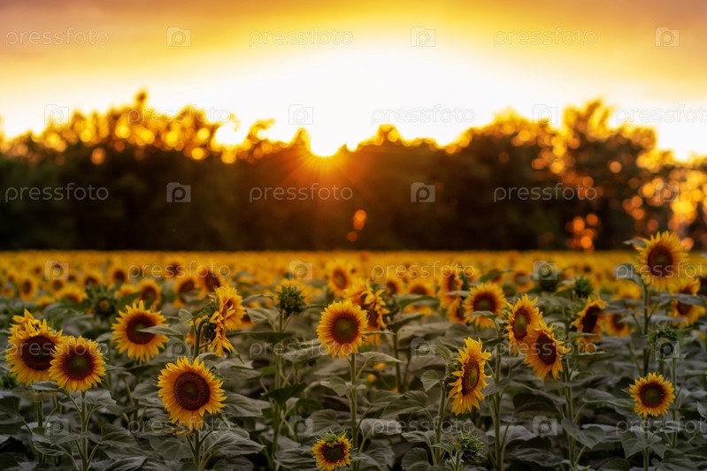 Поле с множеством цветущих подсолнухов во время заката