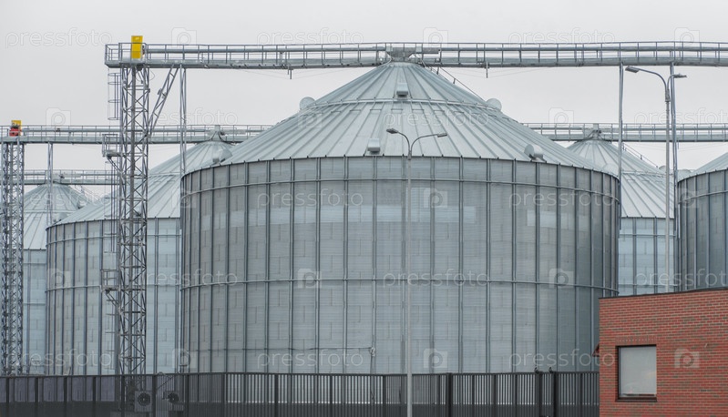 Крупный современный завод по хранению и переработке зерновых культур. Большие железные бочки с зерном. Серебряные силосы на агропромышленном заводе для переработки и сушки