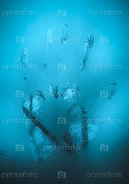 Отпечаток ладони на запотевшем стекле окна, через которое видно дерево. Атмосфера тревоги, тайны, мистики. Необычный синий фон или обложка