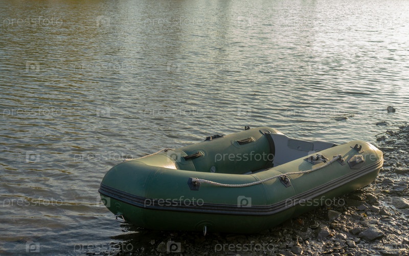 Резиновая зеленая надувная лодка лежит на берегу реки. Подготовка к плаванию