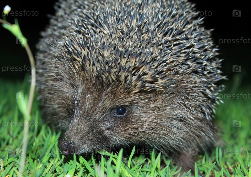 Дикий обыкновенный еж ползает ночью по зеленой траве в поисках пищи. Ежик попал в фотоловушку. Красивый ежик смотрит в камеру