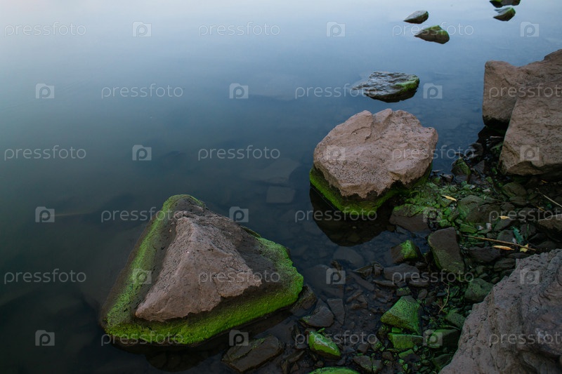 Треугольный камень у берега водохранилища во время тумана. Красиво заросший зелеными водорослями у основания. Спокойная, чистая и прозрачная вода. Скалистый берег и дно водоема