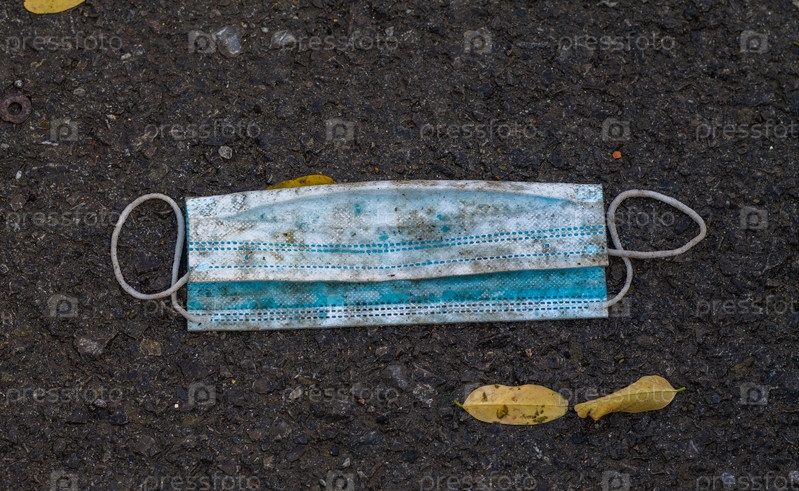 Использованная медицинская маска, грязная и валяющаяся на асфальте. Загрязнение окружающей среды и последствия использования одноразовых масок для защиты от коронавируса и других инфекций