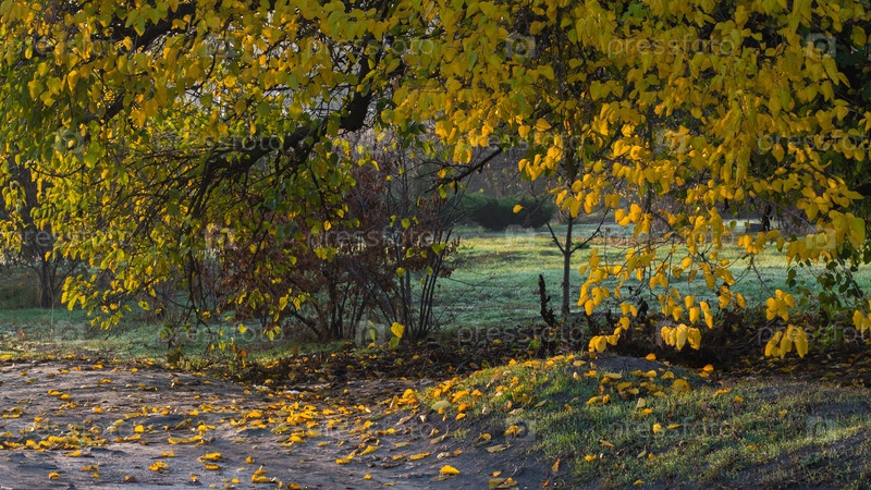 Осенний парковый пейзаж. Пожелтевшие листья кроны дерева начинают падать на грунтовую дорожку
