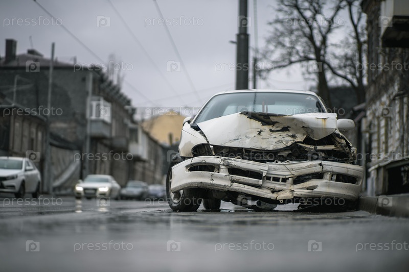 Автокатастрофа на ул. Автомобиль, поврежденный после тяжелой аварии, стоит на улице города. Концепция страхования от несчастных случаев