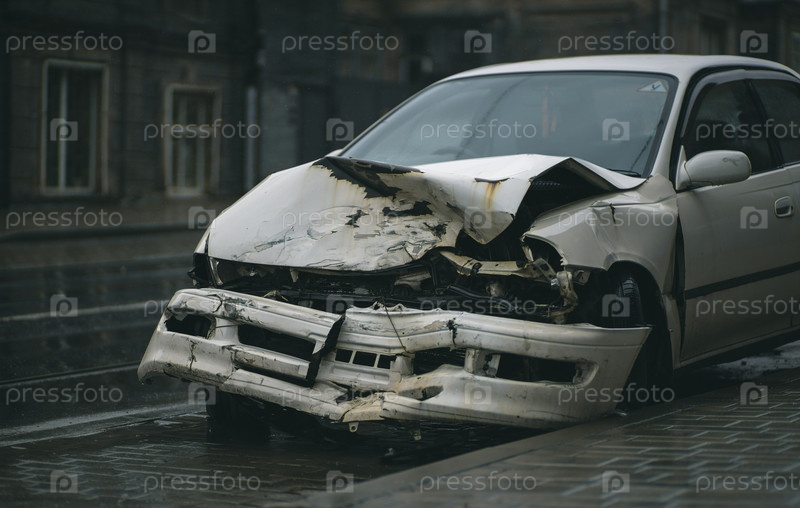 Автокатастрофа на ул. Автомобиль, поврежденный после тяжелой аварии, стоит на улице города. Концепция страхования от несчастных случаев