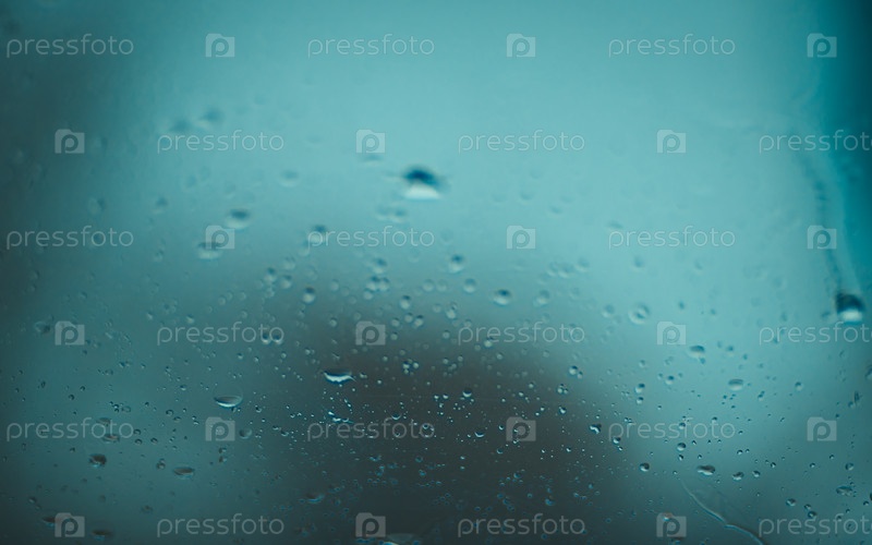 Красивый синий фон, капли дождя на стекле красиво размыты. Атмосфера грусти и печали