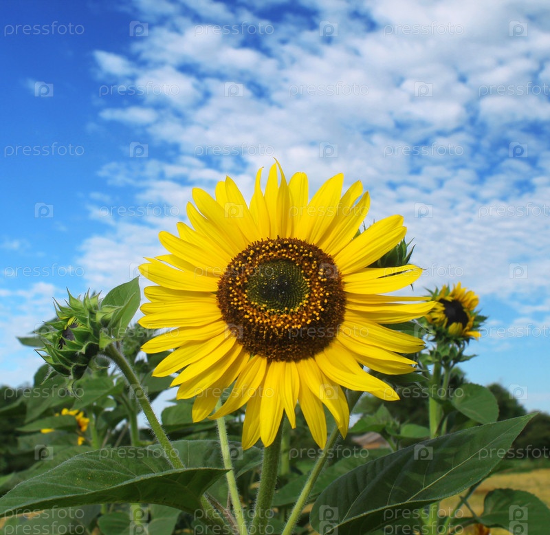 Цветущий подсолнух на фоне голубого неба с красивыми облаками