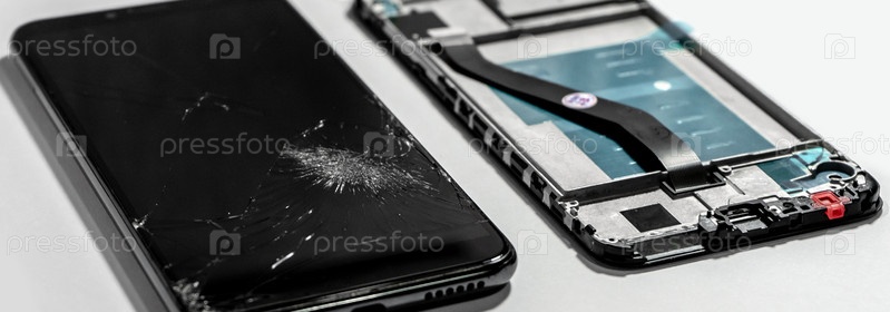 Ремонт мобильных устройств. Сломанный сенсорный дисплей черного смартфона перед заменой его на совершенно новый. Повреждение крупным планом