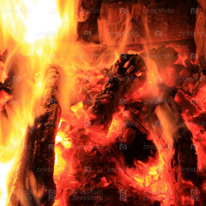 Горящие и пылающие брикеты из раскаленного угля, крупный план. Горячие угли в печи