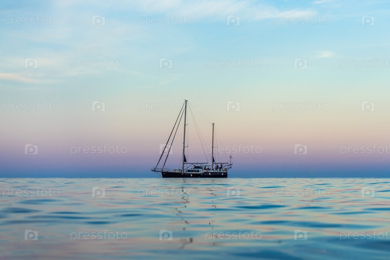 Спокойствие. Хорошая погода на закате, спокойное море или океан. Облаков немного и их видно очень далеко. Вдали плывет лодка с опущенными парусами