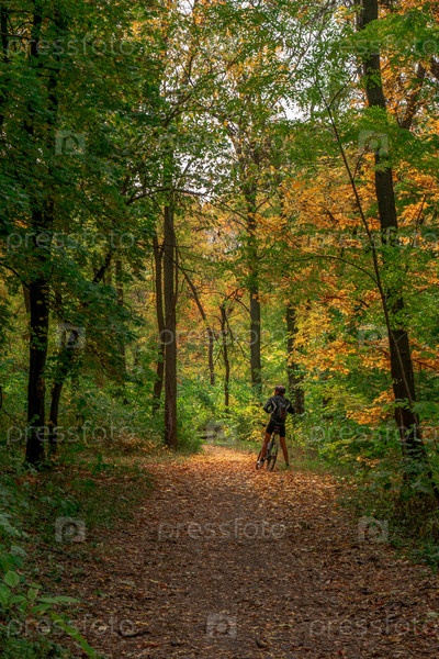 Земляная дорожка в парке с деревьями. Зеленая листва начинает желтеть и опадать. Начало осени. Мужчина с велосипедом