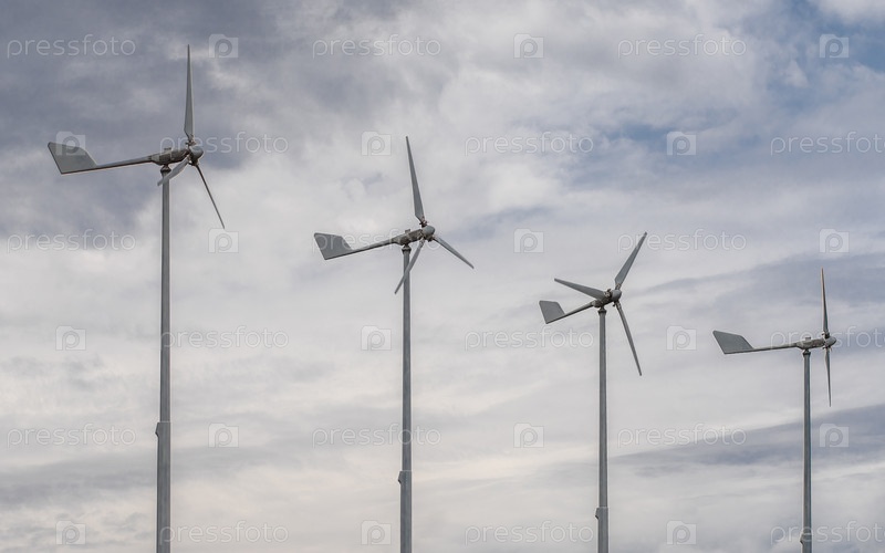 Четыре небольших ветряка на фоне облаков. Экологически чистый источник энергии. Домашняя электростанция