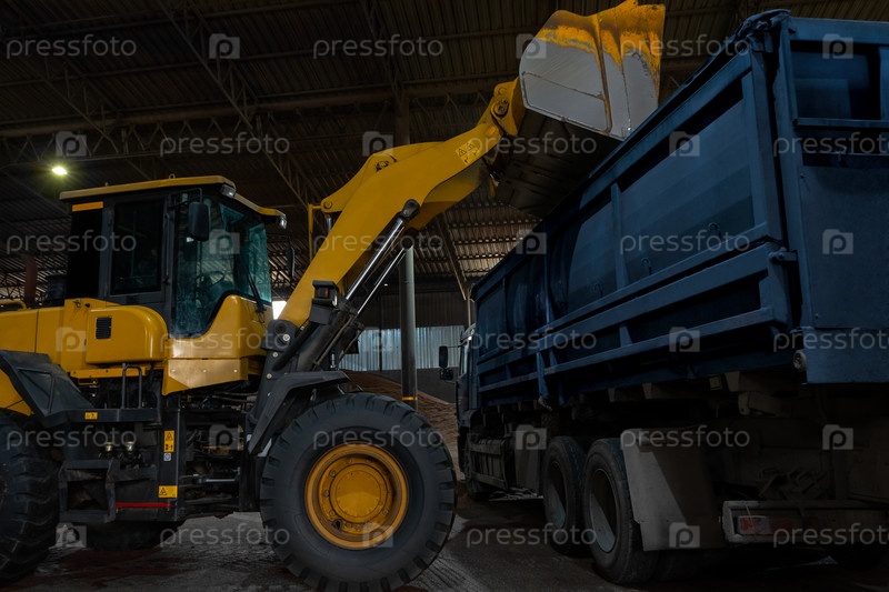 Загрузка грузовика грузом с помощью фронтального погрузчика, ковша