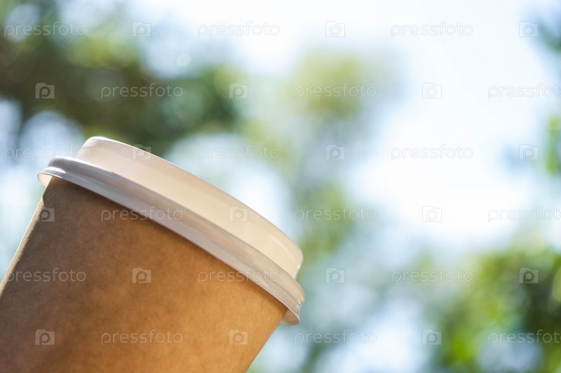 Бумажная одноразовая кофейная чашка на белом столе с осенним боке