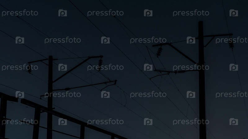 Линии электропередач над железной дорогой ночью. Силуэт линий электропередач против неба
