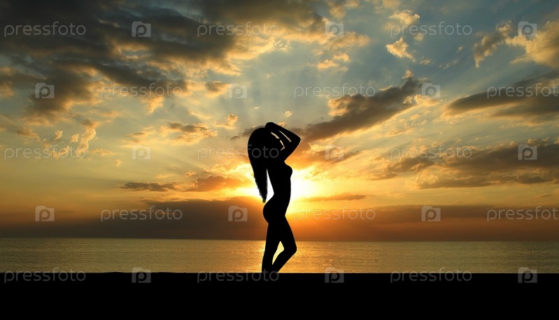 Силуэт стройной молодой девушки на фоне заката на берегу моря. Девушка поправляет волосы