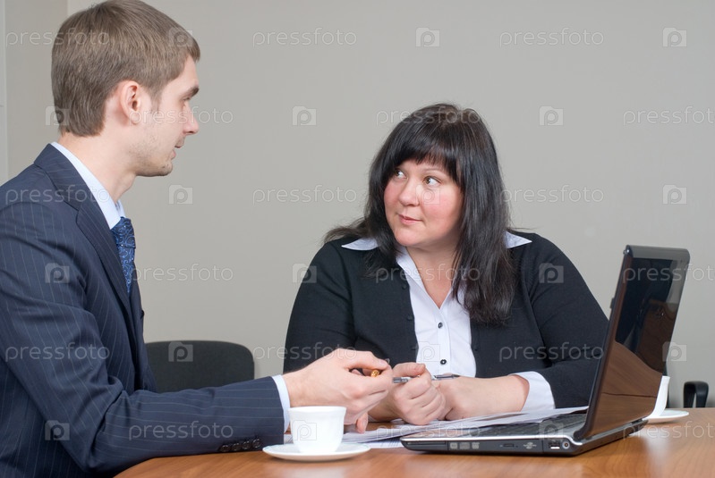 Бизнесмен и коммерсантка обсуждают вопросы в офисе