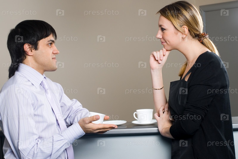 Встреча молодого бизнесмена и бизнесвумен на кофе-брейке