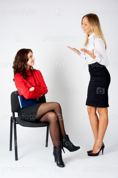 Две молодые привлекательные деловые женщины проводят неформальную встречу на белом фоне