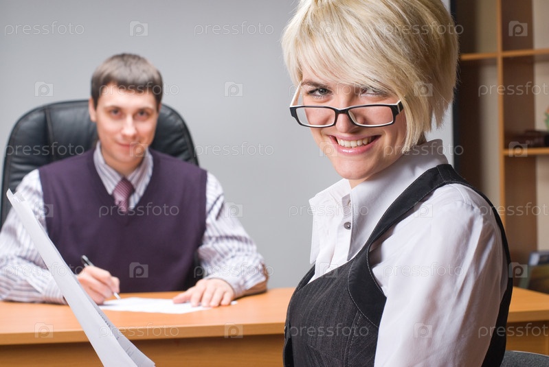 Улыбающаяся деловая женщина изучает документ на фоне коллеги в офисе
