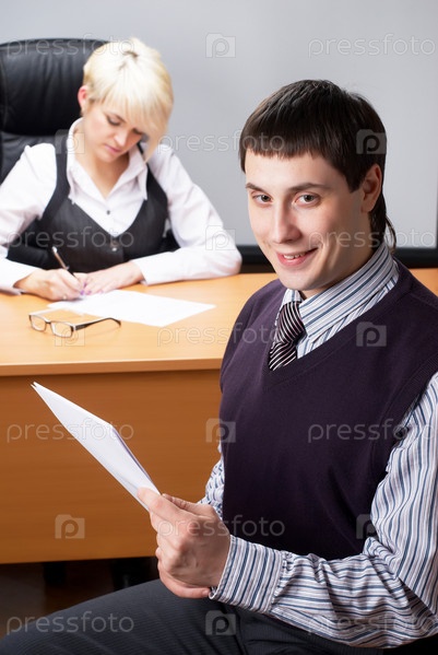 Деловой человек читает документ на фоне коллеги в офисе