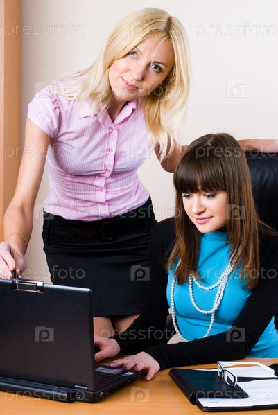 Две коллеги по бизнесу обсуждают, сидя за столом вместе в офисе, работая на ноутбуке, концепция совместной работы