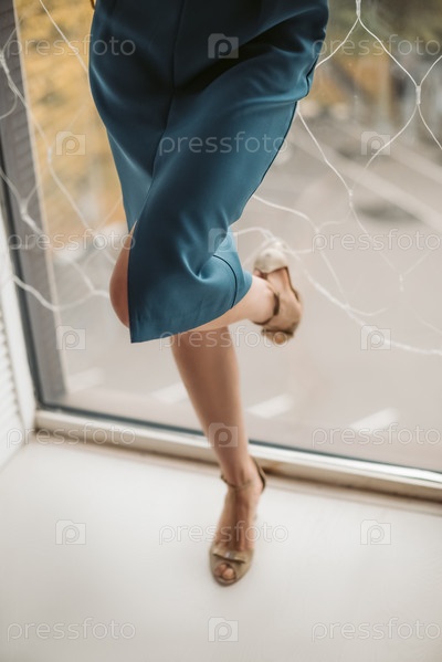 Женщина в голубом платье и на высоких каблуках стоит у окна пяткой к стеклу