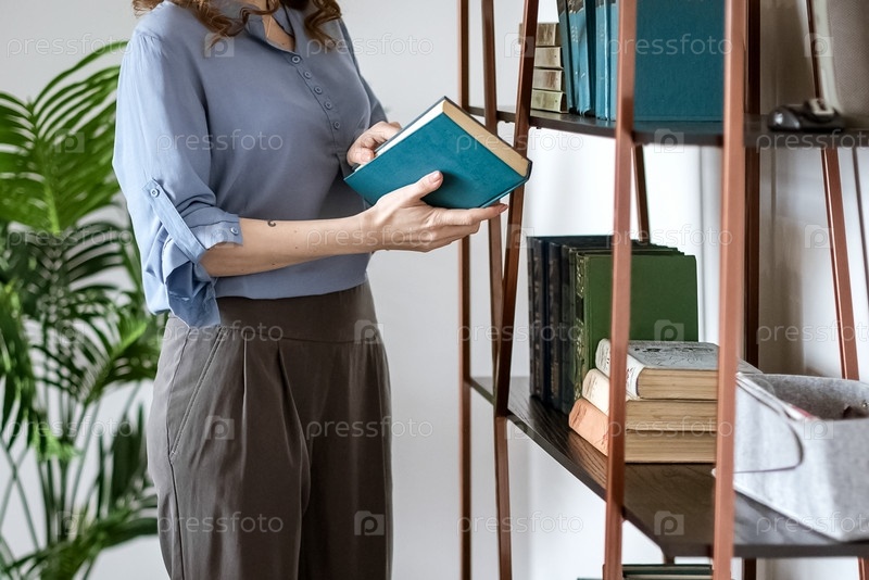 Женщина выбирает книгу, стоящую возле книжной полки с книгой в руке, готовую открыть ее