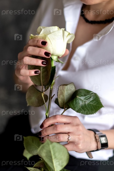Женщина держит в руках белую розу с длинным стеблем крупным планом